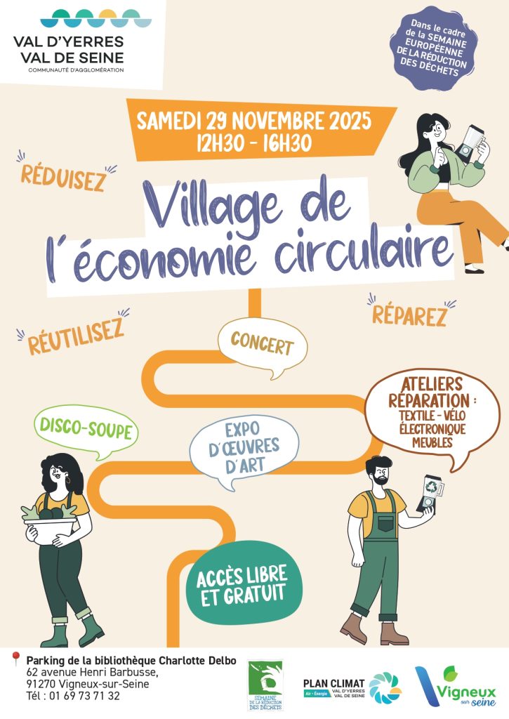 Ne manquez pas le point culminant de la semaine : le Village de l’Économie Circulaire, qui se tiendra le 29 novembre sur le parking de la Bibliothèque Charlotte Delbo. Vous y retrouverez plusieurs stands de réparation, une exposition des artistes Bisk et Lor-K, ainsi que de la musique et de la nourriture préparée à partir d’invendus !